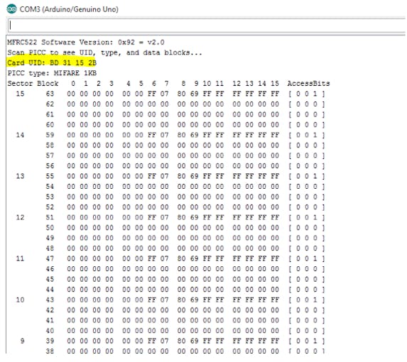 Esta es la información que puede leer de la tarjeta, incluido el UID de la tarjeta que está resaltado en amarillo. La información se almacena en la memoria que se divide en segmentos y bloques como puedes ver en la imagen anterior.